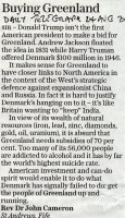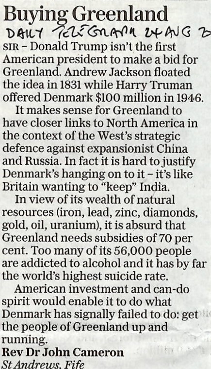 One such shaft of brilliance was a letter in Saturday’s Daily Telegraph which could unkindly be sub-headlined “the view from the manse”. Supporting the proposal to buy Greenland the writer gives no thought to the outcomes for the present inhabitants – only to characterize them as requiring (permanent) subsidies and being alcohol addicted.